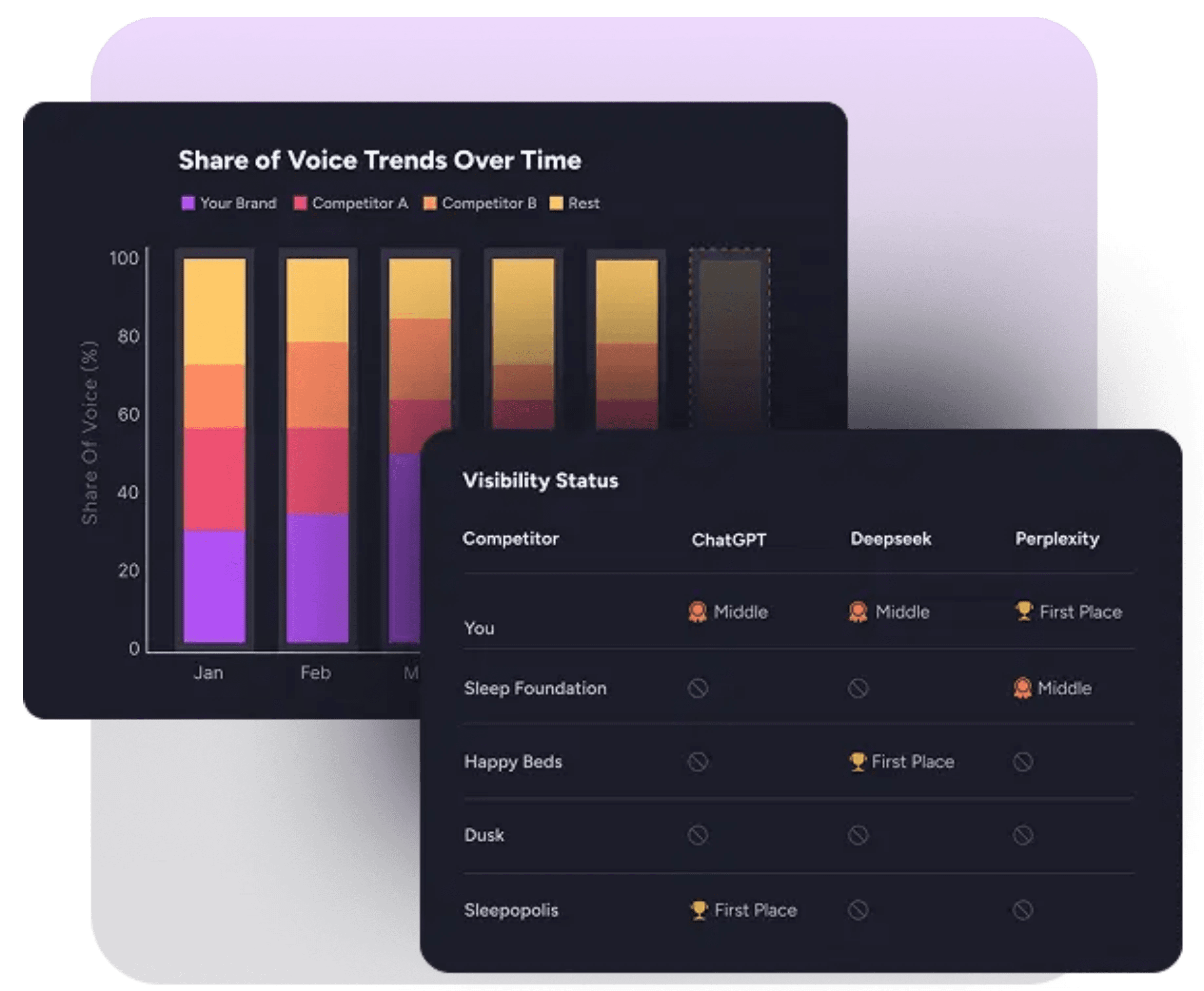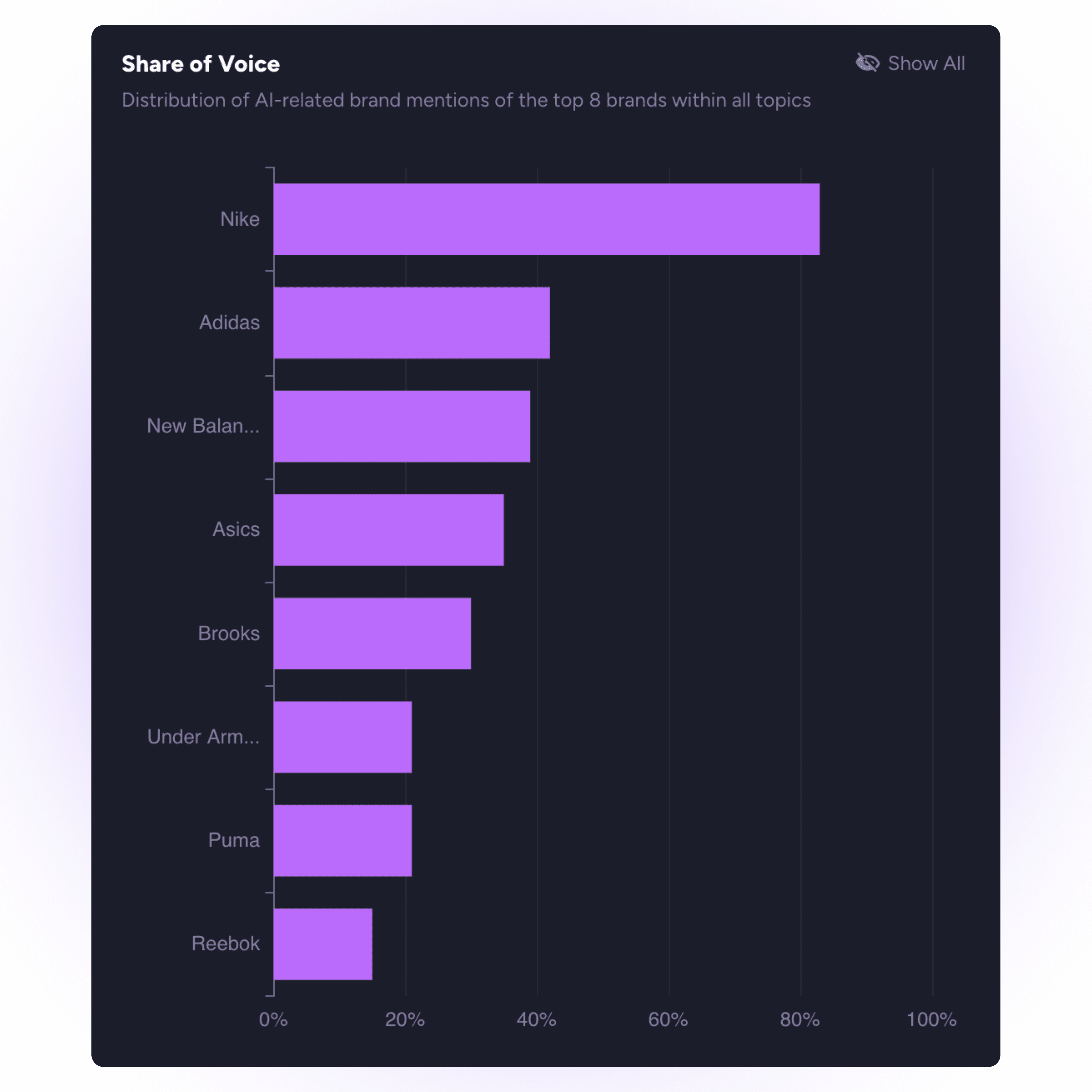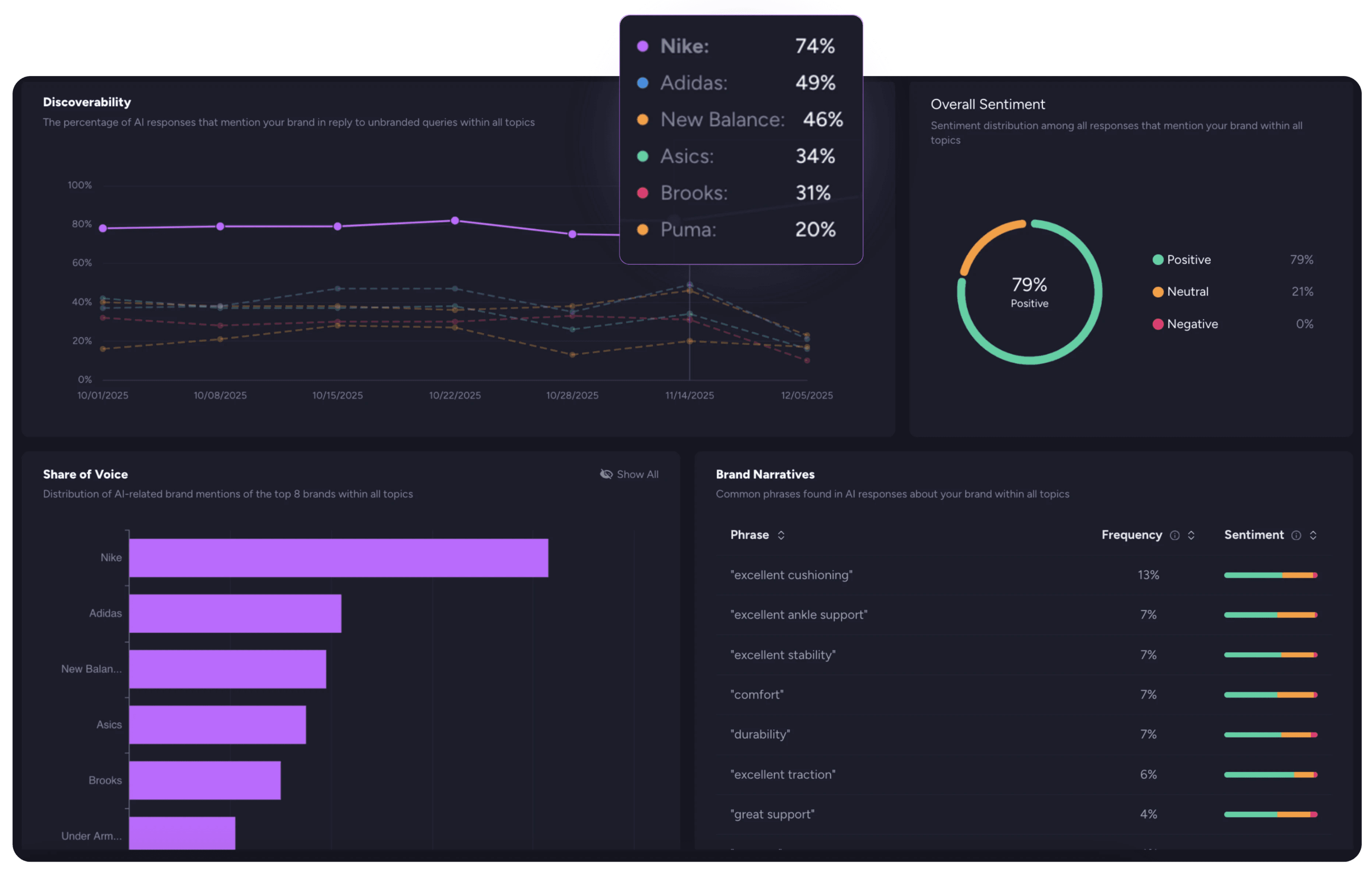 See how frequently AI assistants reference your brand and how that frequency compares to competitors across platforms and topics. Share of Voice analysis reveals visibility trends, emerging gaps, and changes in how AI systems surface your brand over time.