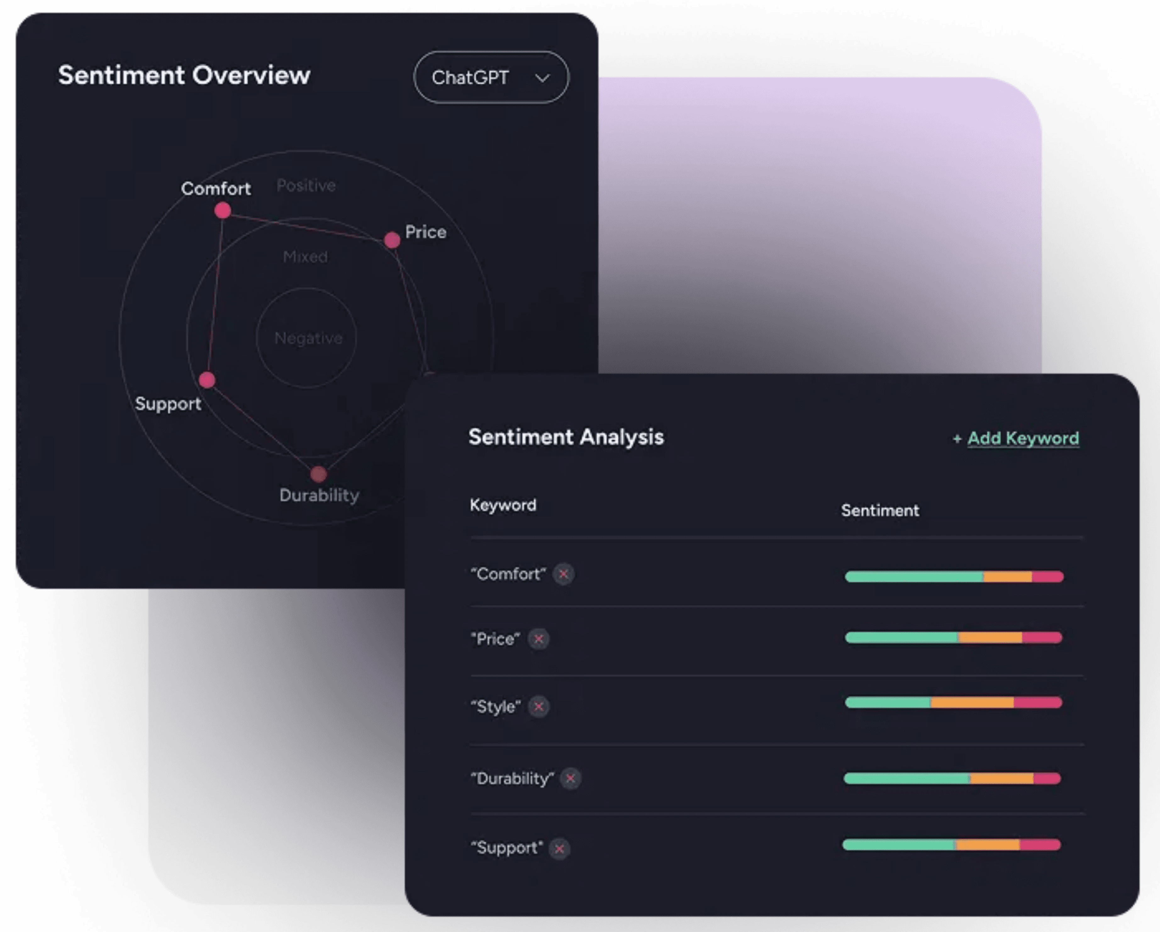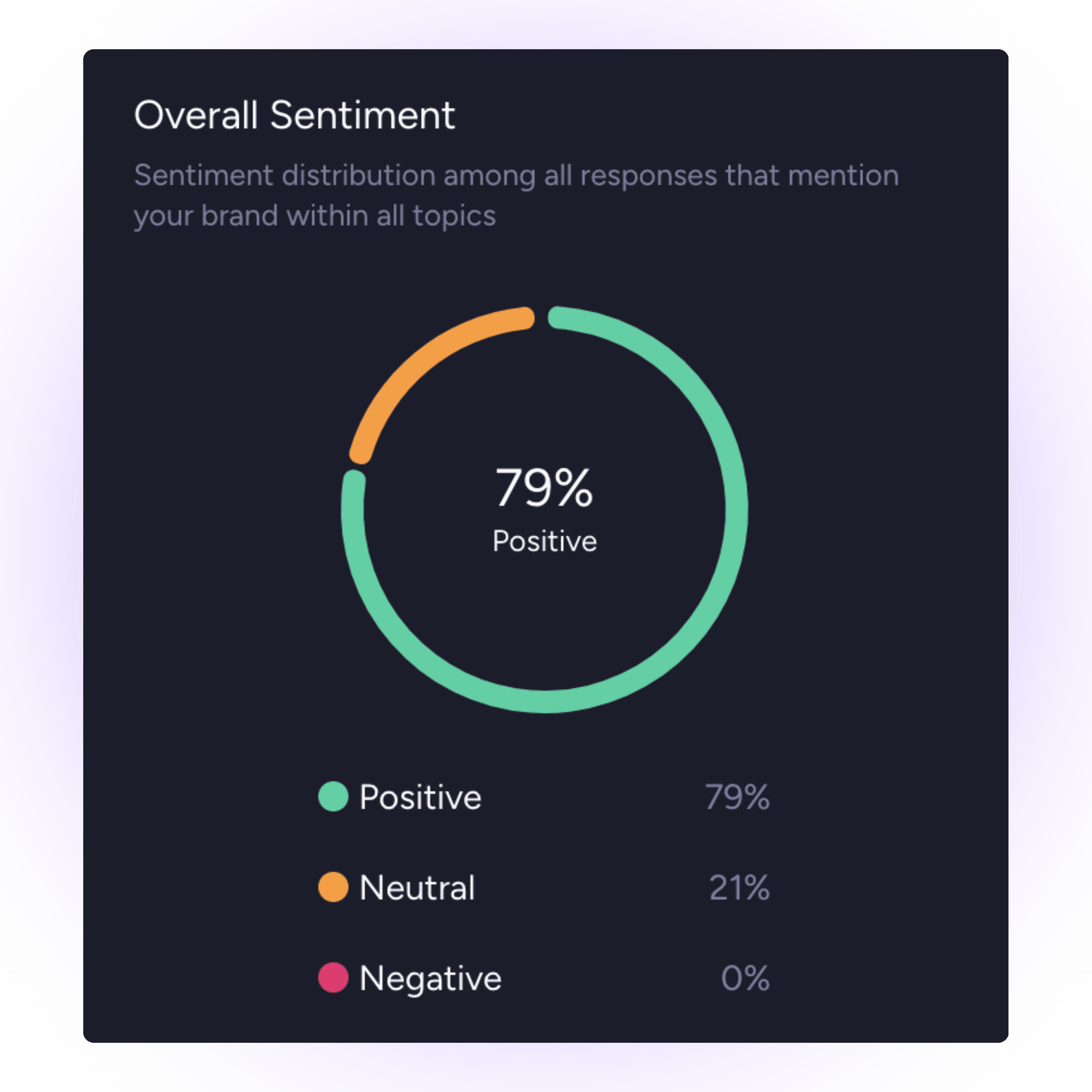 Measure how AI systems frame and characterize your brand across generated responses. Sentiment analysis reveals tone, keyword associations, and positioning patterns, helping teams identify misalignment and adjust messaging with precision.