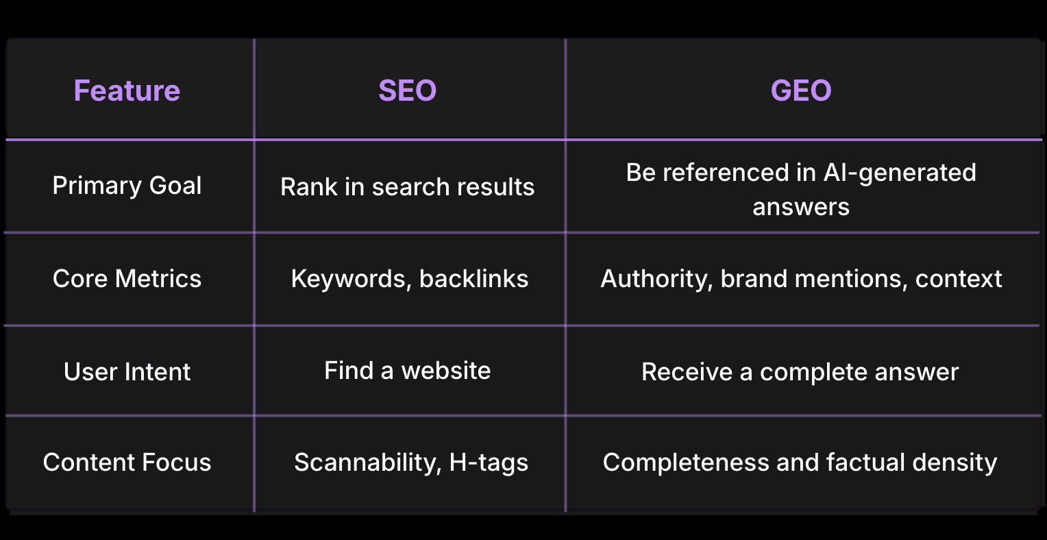 SEO was built for retrieval; surfacing the right link. GEO is built for interpretation; synthesizing information into a cohesive response.